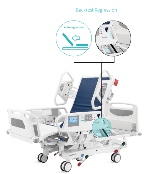 - La retracción de estos componentes extiende la superficie de la cama en la zona pélvica, aliviando la presión y las fuerzas de cizallamiento, minimizando así el riesgo de úlceras por presión.